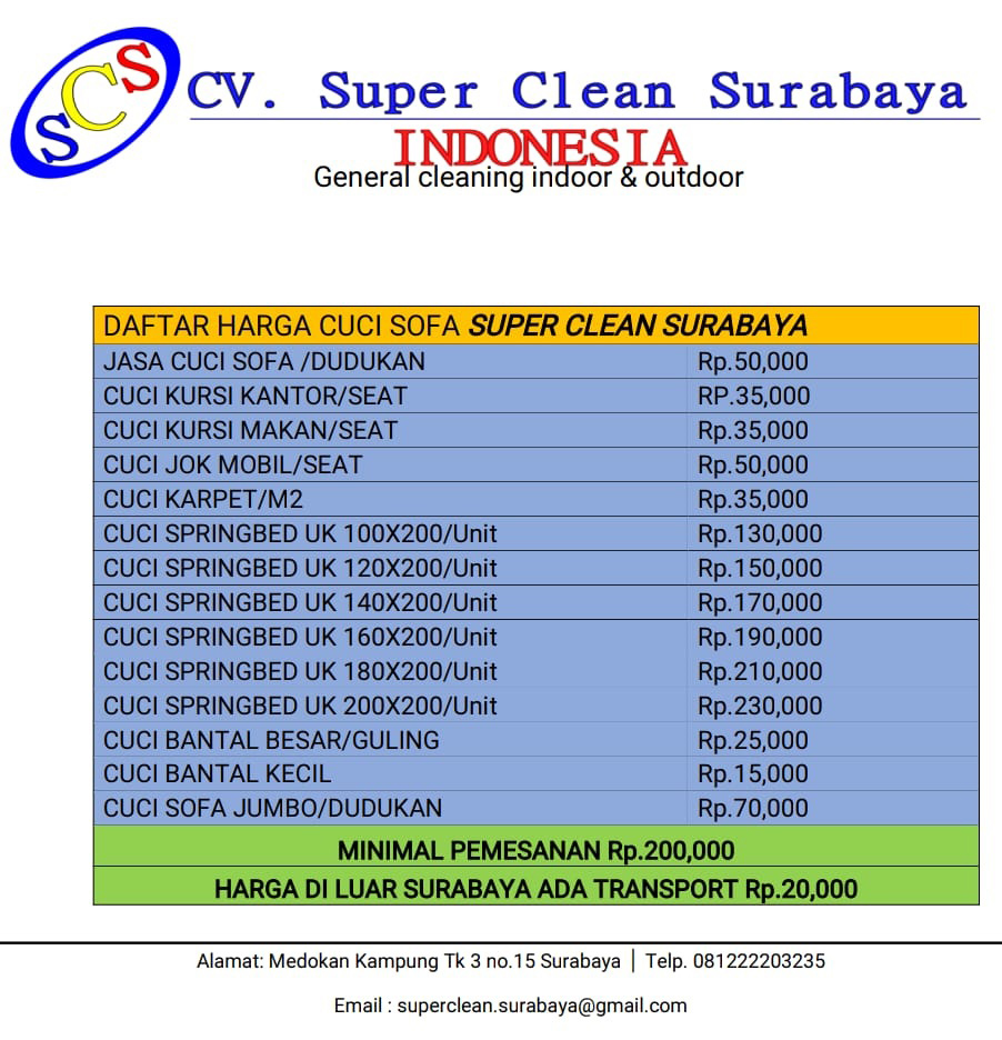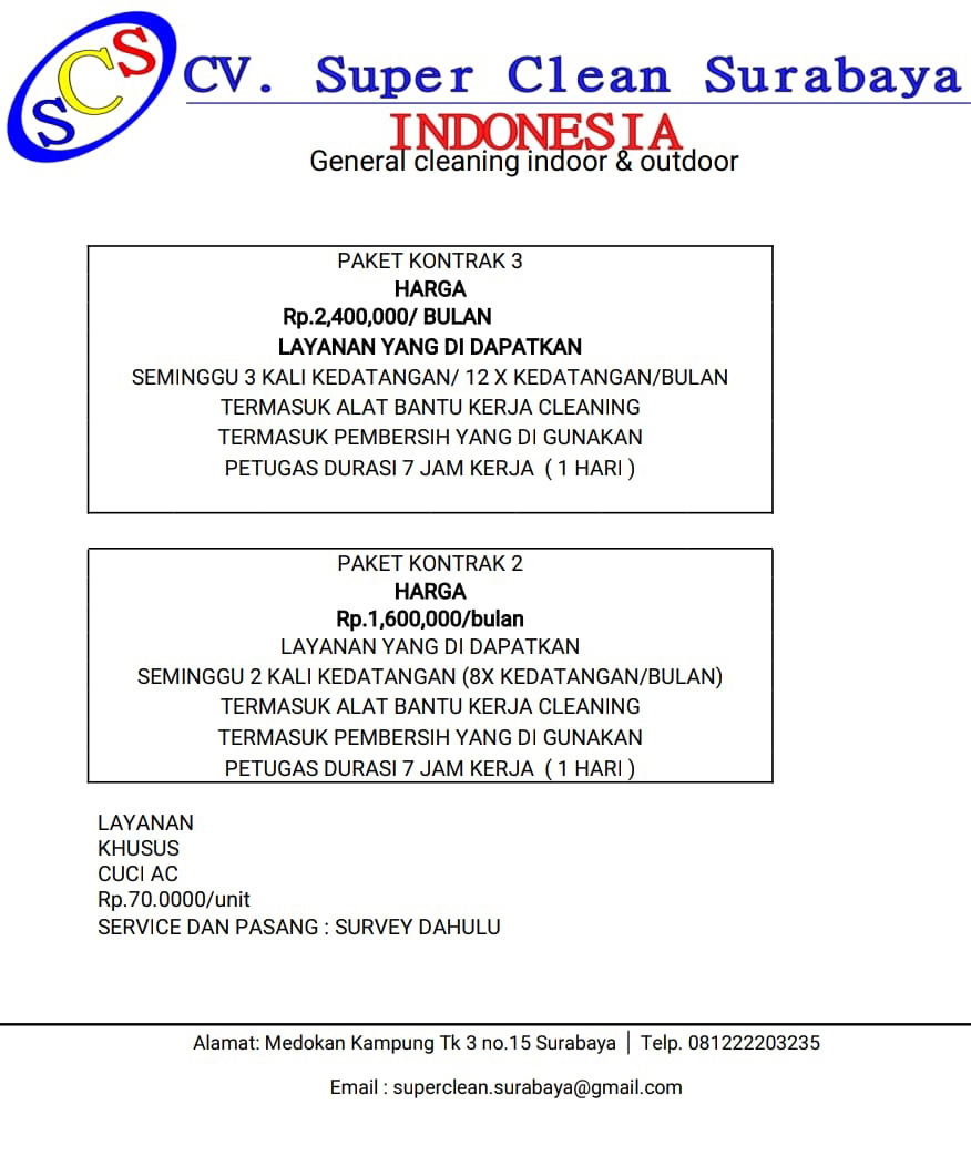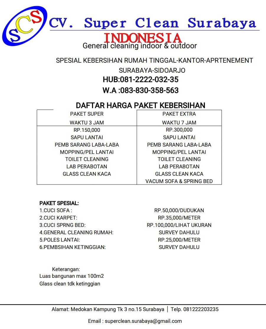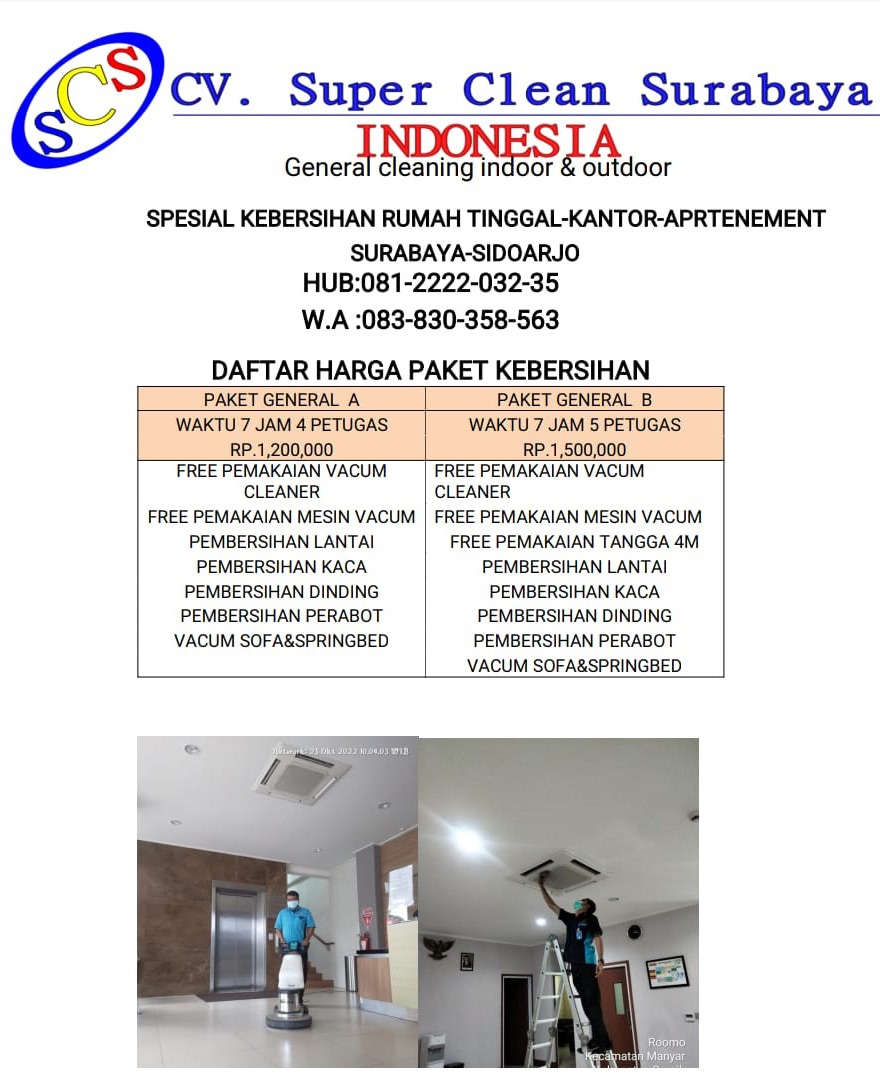 Cleaning Service Surabaya menyediakan layanan kebersihan profesional untuk rumah, kantor, dan bisnis dengan hasil berkualitas, jadwal fleksibel, dan harga terjangkau. Didukung tim berpengalaman serta bahan ramah lingkungan, kami siap memastikan lingkungan Anda bersih dan nyaman |